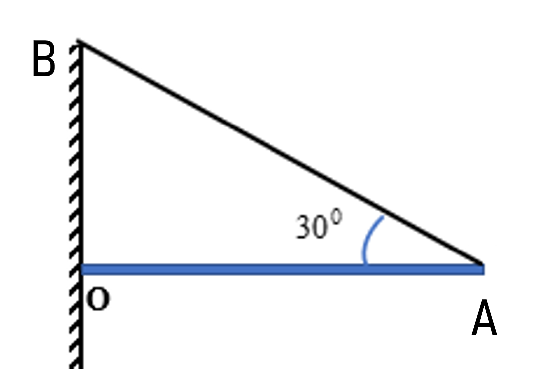 Một thanh dài OA đồng chất, tiết diện đều, có khối lượng 2 kg. Một đầu O của thanh liên kết với tường bằng một bản lề, còn đầu A được treo vào tường bằng một sợi dây AB. Thanh được giữ nằm ngang như hình vẽ. Lấy g =10 m/. Tính lực căng của dây.