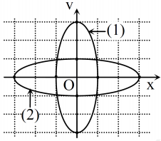 Cho hai vật dao động điều hòa dọc theo hai đường thẳng cùng song song với trục . Vị trí cân bằng của mỗi vật nằm trên đường thẳng vuông góc với trục tại . Trong hệ trục vuông góc , đường (1) là đồ thị biểu diễn mối quan hệ giữa vận tốc và li độ của vật 1, đường (2) là đồ thị biểu diễn mối quan hệ giữa vận tốc và li độ của vật 2 (hình vẽ). Biết các lực kéo về cực đại tác dụng lên hai vật trong quá trình dao động là bằng nhau. Tỉ số giữa khối lượng của vật 2 với khối lượng của vật 1 là?