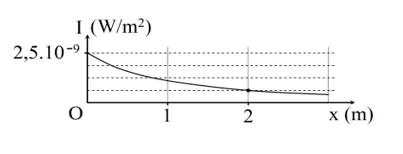 (QG 17): Tại một điểm trên trục Ox có một nguồn âm điểm phát âm đẳng hướng ra môi trường. Hình vẽ bên là đồ thị biểu diễn sự phụ thuộc của cường độ âm I tại những điểm trên trục Ox theo tọa độ x.