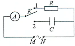 Trong giờ thực hành, để đo điện dung của một tụ điện, một học sinh mắc mạch điện theo sơ đồ như hình bên. Đặt vào hai đầu một điện áp xoay chiều có giá trị hiệu dụng không đổi và tần số . Khi đóng khóa vào chốt 1 thì số chỉ của ampe kế là . Chuyển khóa sang chốt 2 thì số chỉ của ampe kế là . Biết . Bỏ qua điện trở của ampe kế và dây nối. Giá trị của là