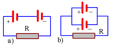 Hai nguồn điện có cùng E và r được mắc với R = 11 ôm. Hình a thì cường độ dòng điện qua R là 0,4 A còn Hình b thì cường độ chạy qua R là 0,25 A. Tính E và r.