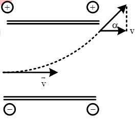Hai bản kim loại phẳng đặt nằm ngang, đối diện, song song cách nhau một khoảng d tạo thành một tụ điện phẳng. Giữa hai bản tụ có một hiệu điện thế U. Hướng một chùm hẹp các electron quang điện có tốc độ V theo phương ngang đi vào giữa hai bản tại điểm O cách đều hai bản thì khi nó vừa ra khỏi hai bản nó có tốc độ 2V. Khi vừa ra khỏi tụ điện vec tơ vận tốc hợp với véc tơ vận tốc ban đầu một góc