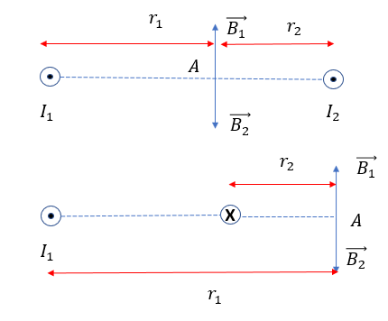 Để hai véc tơ cảm ứng từ ngược chiều vị trì tổng hợp nằm ngoài gần với vị trí có cường độ dòng điện lớn hơn và
