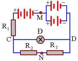 Bộ nguồn có 7 nguồn giống nhau, mỗi nguồn có E = 2 V, r = 0,2 ôm. Đèn dây tóc Đ loại 6V - 12 W, R1 = 2,2 ôm, R2 = 4 ôm, R3 = 2 ôm. Chọn phương án đúng.