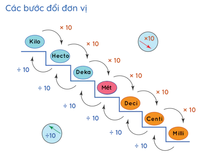 | 1 milimét (mm) = 0,001 m 1 xentimét (cm) = 0,01 m 1 đềximét (dm) = 0,1 m 1 kilômét (km) = 1 000 m | (1 m = 1 000 mm) (1 m = 100 cm) (1 m = 10 dm) (1 m = 0,001 km) |