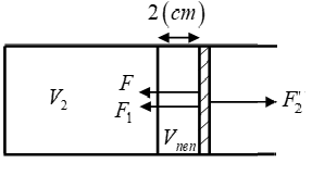 Một lượng không khí có thể tích bị giam trong một xilanh có pít – tông đóng kín như hình vẽ, diện tích của pít – tông là , áp suất khí trong xilanh bằng áp suất ngoài là . Cần một lực bằng bao nhiêu để dịch chuyển pít – tông sang trái . Bỏ qua mọi ma sát, coi quá trình trên đẳng nhiệt.