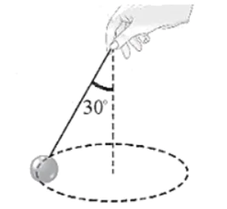 Một trái bóng được buộc vào một sợi dây và quay tròn đều trong mặt phẳng ngang như Hình 5.1. Trái bóng quay một vòng trong 1 s với tốc độ 0,5 m/s. Biết góc hợp bởi dây và phương thẳng đứng là