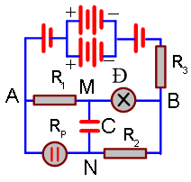 Cho mạch điện như hình vẽ. Bộ nguồn gồm 6 nguồn giống nhau, mỗi nguồn có suất điện động 2,25V, điện trở trong 0,5Ω. Bình điện phân có điện trở chứa dung dịch CuS, anot làm bằng đồng. Đương lượng gam của đồng là 32. Tụ điện có điện dung C = 6 . Đèn Đ loại 4V – 2W, các điện trở có giá trị = 0,5 = = 1Ω. Biết đèn Đ sáng bình thường. Chọn phương án đúng.