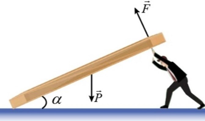 Người ấy tác dụng một lực F bằng bao nhiêu theo phương vuông góc với tấm gỗ vào đầu trên của tấm gỗ để giữ cho nó hợp với mặt đất một góc
