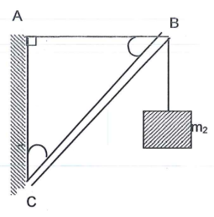 Thanh BC nhẹ, gắn vào tường bởi bản lề C, đầu B treo vật có khối lượng m = 4 kg và được giữ cân bằng nhờ dây treo AB. Cho AB = 30 cm, AC = 40 cm. Xác định lực tác dụng lên BC.