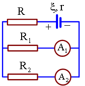Cho mạch điện có sơ đồ như hình vẽ, trong đó bộ nguồn có suất điện động 42,5 V và điện trở trong 1 Ω, điện trở = 10 Ω; = 15 Ω. Điện trở của các ampe kế và của các dây nối không đáng kể. Biết ampe kế chỉ 1,5 A. Số chỉ của ampe kế và trị số của điện trở R lần lượt là