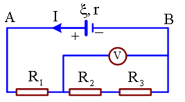 Cho mạch điện có sơ đồ như hình vẽ, trong đó nguồn điện có suất điện động 30 V và điện trở trong 3 Ω, các điện trở = 12 Ω, = 27 Ω, = 18 Ω, vôn kế V có điện trở rất lớn. Số chỉ của vôn kế là