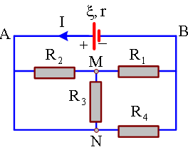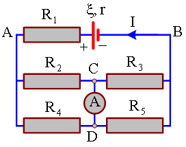 Cho mạch điện như hình vẽ. Trong đó = 6 V, r = 0,5Ω, = = 2 Ω, = = 4 Ω, = 6 Ω. Điện trở của ampe kế và của các dây nối không đáng kể. Số chỉ của ampe kế là