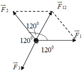 Cho ba lực đồng quy cùng nằm trong một mặt phẳng, có độ lớn bằng nhau bằng 80 N và từng đôi một làm thành góc 120 độ.
