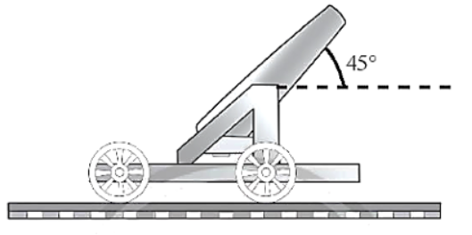 Một khẩu pháo gắn chặt vào xe và xe có thể di chuyển dọc theo đường ray nằm ngang như Hình 4.7. Khẩu pháo bắn ra một viên đạn khối lượng 200 kg với tốc độ 125 m/s theo hướng hợp với phương ngang