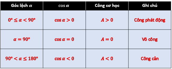 Khi lực không đổi tác dụng lên một vật và điểm đặt của lực đó chuyển dời một đoạn s theo hướng hợp với hướng của lực góc thì công thực hiện được bởi lực đó được tính theo công thức