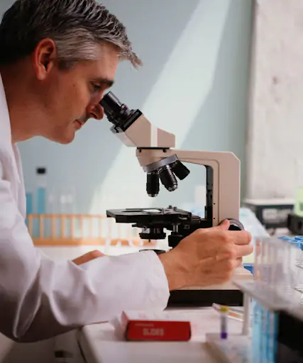 Nhà khoa học đang sử dụng kính hiển vi để nghiên cứu về Khoa học Tự nhiên