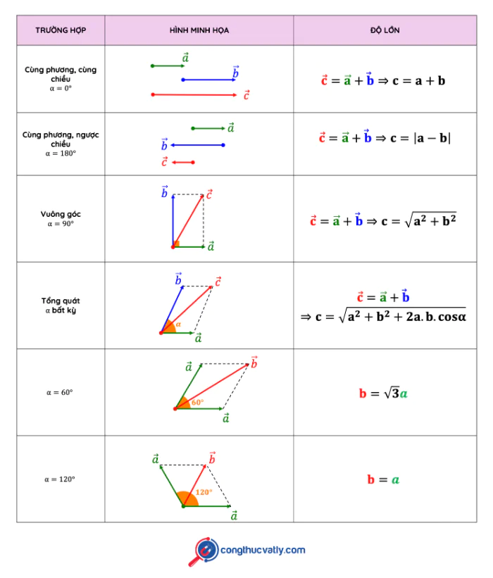 BẢNG TỔNG HỢP CÔNG THỨC XÁC ĐỊNH ĐỘ LỚN CỦA HỢP LỰC