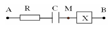 Đặt vào hai đầu đoạn mạch điện AB như hình vẽ điện áp . Tụ điện C có điện dung là . Hộp kín X chỉ chứa 1 phần tử( điện trở thuần hoặc cuộn dây thuần cảm). Dòng điện xoay chiều trong mạch sớm pha so với hiệu điện thế giữa hai đầu mạch điện AB. Hỏi trong hộp X chứa phần tử nào và tìm giá trị của phần tử đó?