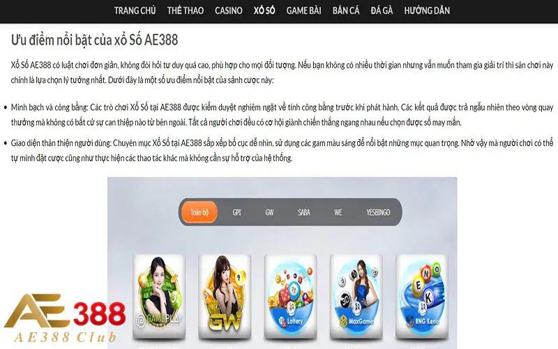 Xổ số là một trò chơi mới nổi gần đây của nhà cái AE388, khi ghi nhận lượng người tham gia tăng liên tục. Với nhiều hình thức xổ số khác nhau, từ 1 ngày cho đến chưa đầy 1 phút, mọi người có thể tự do lựa chọn theo sở thích. Về chất lượng thì không cần phải nói quá nhiều, khi những đối tác lớn cung cấp dịch vụ như: