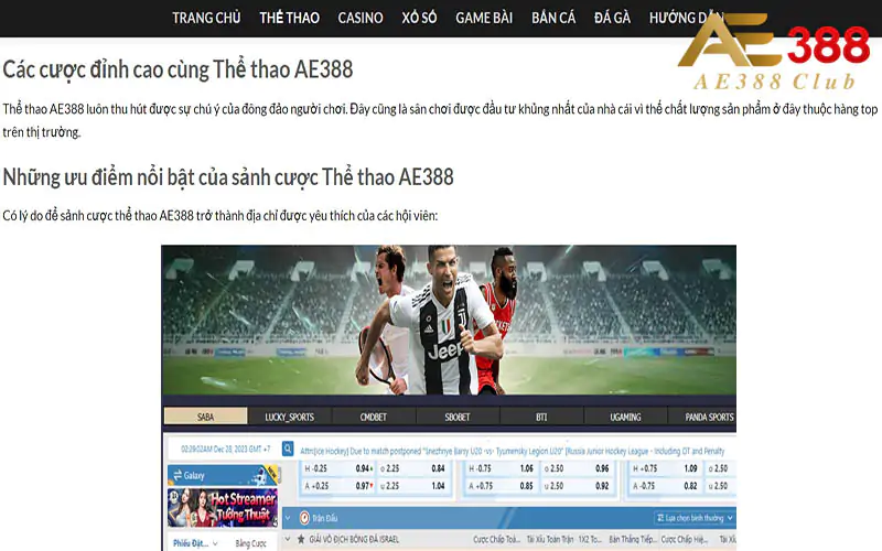 Nói đến thể thao, AE388 luôn tự tin là một trong những sân chơi cung cấp dịch vụ đỉnh nhất. Không chỉ về những kèo cược khủng hoặc độc đáo, mà hầu như những trận đấu quan trọng đều được chiếu tại đây. Nhiều trò chơi hấp dẫn mà chúng ta có thể nhắc đến như bóng đá, bóng chuyền, bóng rổ, đua ngựa,... Một vài ông lớn mà anh em đam mê thể thao đều đã từng nghe qua như sau: