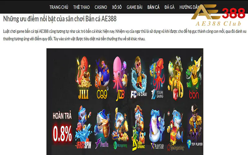 Bắn cá là tựa game cực hot gần đây, khi nhà nhà người người đang tìm kiếm trò chơi này trên nhiều nền tảng khác nhau. Đến với AE388, anh em không phải lo nhiều về chất lượng trò chơi khi được tham gia vào những đại dương lớn cùng nhiều sinh vật mới mẻ. Điều này cũng đến từ chất lượng đỉnh cao của các đối tác như: