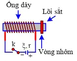 Đặt cố định một ống dây có lõi sắt nằm ngang nối với acquy qua khoá k đang mở (hình vẽ). Để một vòng nhôm nhẹ, kín, linh động ở gần đầu ống dây. Đóng nhanh khoá k thì vòng nhôm