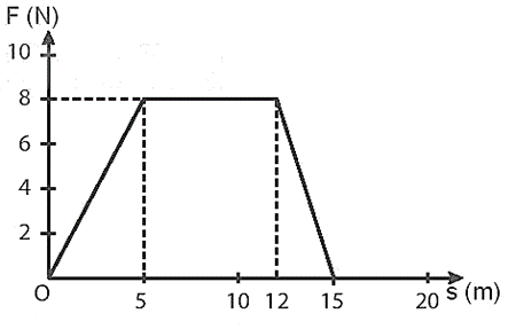 Một vật có khối lượng m = 2 kg đang đứng yên thì bị tác dụng bởi lực F và nó bắt đầu chuyển động thẳng. Độ lớn của lực F và quãng đường s mà vật đi được được biểu diễn trên đồ thị bên.