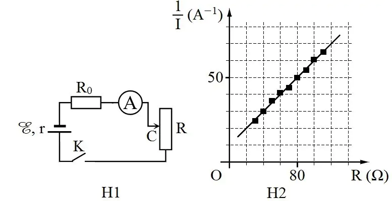 Để xác định suất điện động của một nguồn điện, một học sinh mắc mạch điện như hình bên (H1). Đóng khóa và điều chỉnh con chạy , kết quả đo được mô tả bởi đồ thị biểu diễn sự phụ thuộc của (nghịch đảo số chỉ ampe kế ) vào giá trị của biến trở như hình bên (H2). Giá trị trung bình của được xác định bởi thí nghiệm này là?