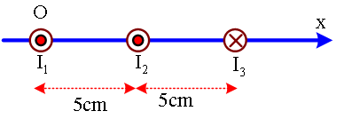 Hệ tọa độ Đề-các vuông góc Oxyz, trong mặt phẳng Oxy, nằm ngang, ba dòng điện thẳng dài cùng song song với trục Oy, = 10 A chạy theo chiều dương của trục Oy, = 45 A chạy theo chiều ngược lại như hình vẽ. Điểm M thuộc trục Ox có hoành độ x hữu hạn. Nếu cảm ứng từ tại M bằng không thì giá tri của x là