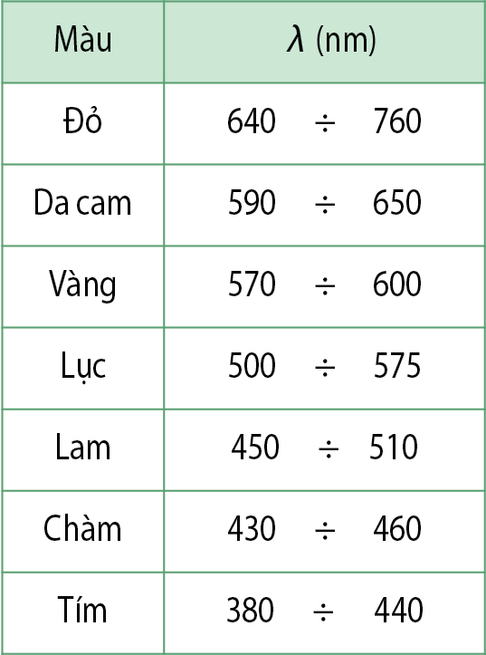 Bảng bước sóng của ánh sáng nhìn thấy trong chân không: