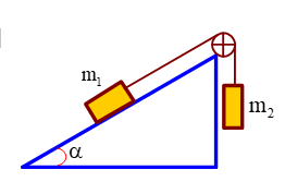 Hai vật có khối lượng: , được nối với nhau bằng dây ko dãn như hình vẽ, lúc đầu hai vật đứng yên. Khi thả ra vật hai chuyển động được thì vận tốc của nó là bao nhiêu? Biết m1 trượt trên mặt phẳng nghiêng góc α = 30° so với phương nằm ngang với hệ số ma sát trượt là µ = 0,1.