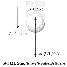 Hình 12.1 biểu diễn các lực tác dụng lên quả tennis đang rơi thẳng đứng. Hãy cho biết lực là lực gì? Cho m = 56 g, hãy tính gia tốc của quả tennis.