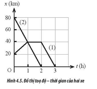Hình 4.5 mô tả đồ thị toạ độ - thời gian của hai xe. Hãy nêu đặc điểm chuyển động của mỗi xe.