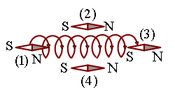 Hình vẽ biểu diễn sự định hướng của bốn nam châm thử ở trong và ngoài ống dây điện. Chiều của nam châm thử vẽ đúng là