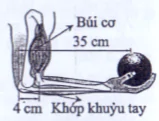 Hình vẽ mô tả cấu trúc bên trong của một cánh tay người đang giữ một vật có trọng lượng 60 N. Búi cơ cung cấp một lực hướng lên. Lực của búi cơ có tác dụng làm cẳng tay quay ngược chiều kim đồng hồ quanh trục quay là khớp khuỷ tay. Tay sẽ giữ được vật nếu mômen của lực tác dụng bởi búi cơ bằng với mômen lực gây ra bởi trọng lượng của vật đối với khớp khuỷu tay. Hãy xác định độ lớn của lực sinh ra bởi búi cơ.