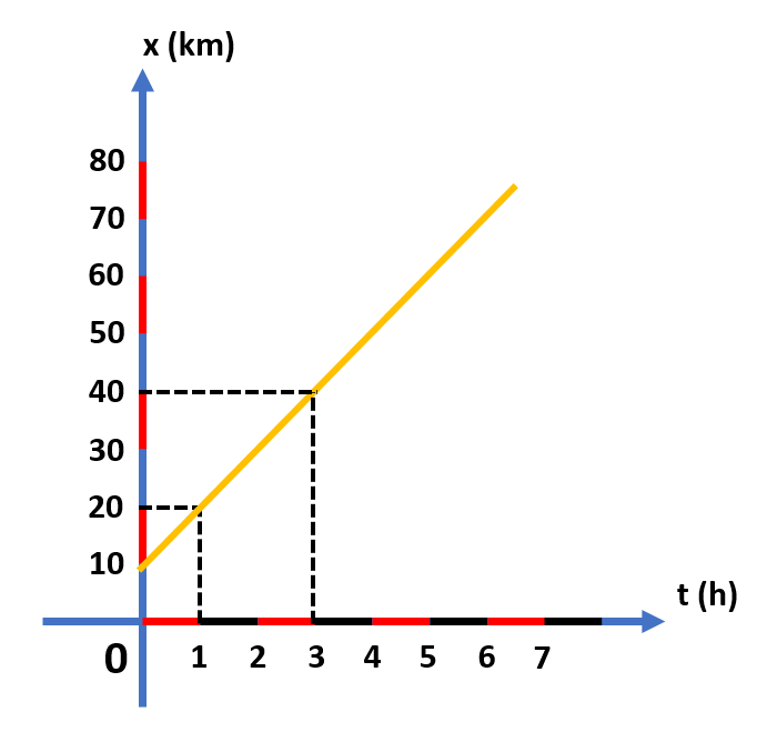 Cho một vật đang chuyển động thẳng đều có đồ thị chuyển động như sau. Với t được tính bằng giờ và x được tính bằng km.
