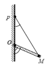 Một thanh đồng chất khối lượng m có 1 đầu được gắn vào tường bằng bản lề, đầu kia được treo bằng dây nhẹ như hình và thanh cân bằng. Phản lực của bản lề tác dụng vào thanh có phương nào?