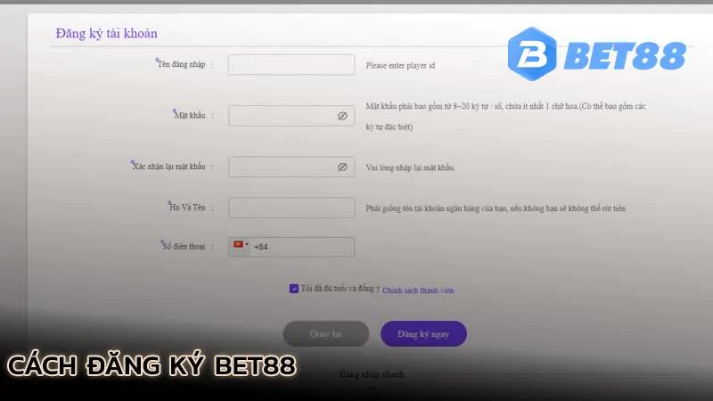 Giao diện đăng ký của Bet88 rất thân thiện và dễ sử dụng. Bạn sẽ thấy các trường thông tin cần thiết như tên, địa chỉ email, số điện thoại và mật khẩu. Mỗi trường đều có ghi chú hướng dẫn cụ thể để bạn không bị nhầm lẫn. Điều này giúp bạn tiết kiệm thời gian và tránh những sai sót không đáng có.