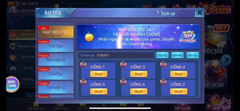 Sau khi liên hệ với nhân viên, đến mục nạp tiền và chọn phương thức nạp tiền mong muốn. Các phương thức có thể bao gồm tài khoản ngân hàng, thẻ cào điện thoại, ví điện tử như Momo, Zalopay, ViettelPay.