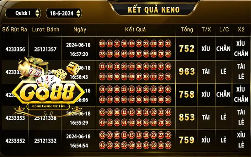 Trong thế giới game online, Keno Go88 nổi bật như một trò chơi xổ số với những cơ hội trúng thưởng khổng lồ, đồng thời mang lại cho người chơi những trải nghiệm cực kỳ thú vị và độc đáo. Sự kết hợp giữa yếu tố may mắn và chiến lược chơi thông minh đã khiến trò chơi này trở thành một sự lựa chọn không thể bỏ qua cho những ai yêu thích thử vận may và chinh phục giải thưởng hấp dẫn. Vậy Keno Go 88 có gì đặc biệt? Làm thế nào để có thể đánh nhanh, giành thưởng lớn?