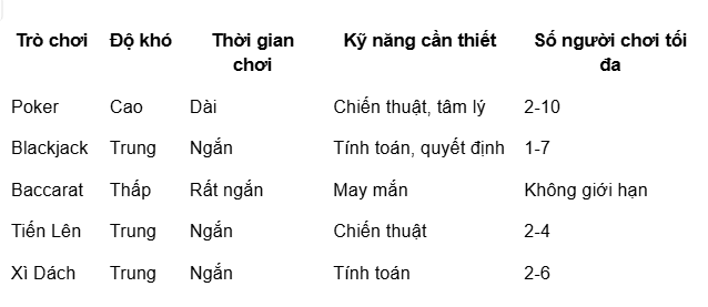 Dưới đây là bảng so sánh các trò chơi chính trong game bài 11bet: