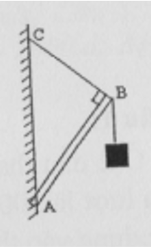 Cho cơ hệ hình vẽ. Trong đó thanh nhẹ AB = 100 cm có đầu A được gắn lên tường và thanh được giữ cân bằng nhờ dây nhẹ BC = 60 cm vuông góc với tường, đầu B của thanh có treo vật m = 1 kg.