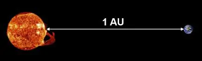 Bằng một đơn vị thiên văn.Mất 8 phút để ánh sáng mặt trời tới Trái Đất.