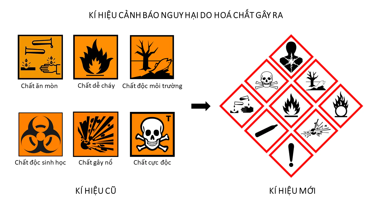 - Kí hiệu cảnh báo nguy hại do hoá chất: hình vuông, viền đen, nền đỏ cam (cũ) hoặc hình thoi, viền đỏ, nền trắng (mới)