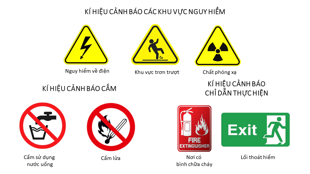 Phân biệt các kí hiệu cảnh báo trong phòng thực hành, kí hiệu cảnh báo cấm, kí hiệu cảnh báo các khu vực nguy hiểm, kí hiệu cảnh báo nguy hại do hoá chất gây ra, kí hiệu cảnh báo chỉ dẫn thực hiện