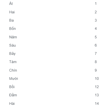 Khi tham gia chơi Thái Hi Lo 2, người chơi cần có kiến thức về các giá trị và điểm số của các quân bài trong bộ bài Tây. Dưới đây là bảng giá trị của các quân bài: