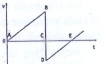 Cho đồ thị vận tốc - thời gian của một quả bóng thả rơi chạm đất rồi nảy lên theo phương thẳng đứng. Quả bóng được thả tại A và chạm đất tại B. Quả bóng rời khỏi mặt đất tại D và đạt độ cao cực đại tại E. Có thể bỏ qua tác dụng của lực cản không khí.
