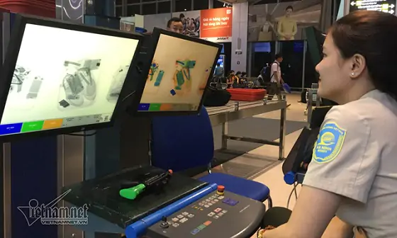 Nhân viên an ninh kiểm tra hành lý thông qua máy soi chiếu bằng tia X tại sân bay.