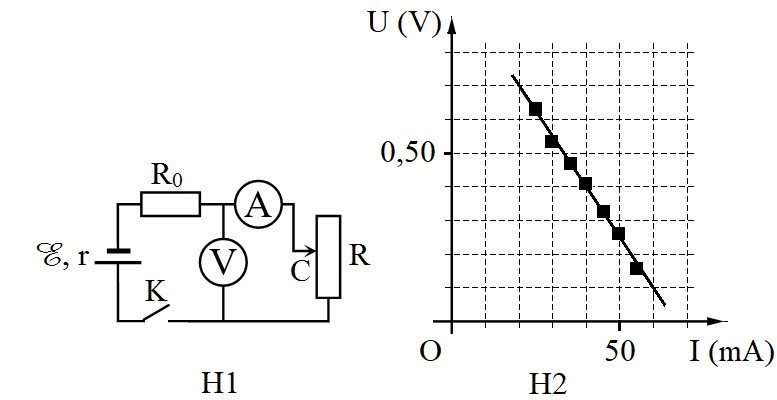 Để xác định điện trở trong của một nguồn điện, một học sinh mắc mạch điện như hình bên (H1). Đóng khóa và điều chỉnh con chạy , kết quả đo được mô tả bởi đồ thị biểu diễn sự phụ thuộc của số chỉ của vôn kế vào số chỉ của ampe kế như hình bên (H2). Điện trở của vôn kế rất lớn. Biết . Giá trị trung bình của được xác định bởi thí nghiệm này là?